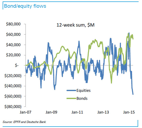 Cosa significa questo, che dopo le equities gli investitori stanno fuggendo anche dalle obbligazioni? Il mercato dell’orso è arrivato e per ora fa danni limitati, ma potrebbe diventare dirompente in caso la Fed alzasse davvero i tassi? Certo, tutto questo è vero. Però ci sono delle variabili strane. Primo, come vi ho dimostrato la settimana scorsa con il grafico che trovate a fondo pagina, sembrava che la grande rotazione fosse in atto, ovvero via dall’azionario in bolla e tutti verso l’obbligazionario. Come si spiega? Io ho un dubbio al riguardo, ovvero ho la netta sensazione che gli inflows verso i bond sovrani siano soltanto flussi di denaro da parte delle Banche centrali, le quali – come vi ho dimostrato due giorni fa parlando degli acquisti mensili della Bce – cominciano a trovare difficoltà nel comprare securities eligibili di lunga durata e quindi innescano da un lato dubbi sulla capacità di proseguire con gli acquisti fino alla data stabilita e dall’altro un riflesso pavloviano sui mercati, con i ribassisti alla Bill Gross che stanno prendendo profitto delle loro minaccia di andare short sul Bund, cosa che sta accadendo.