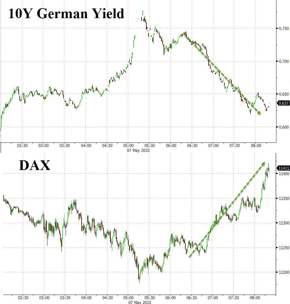 E attenzione, perché se ieri non fosse successo qualcosa di “miracoloso”, sarebbe stato il classico “Black Thursday” per i mercati, roba da -4%. Già, perché poco dopo mezzogiorno, quando la sell-off sull’obbligazionario era in corso, casualmente Euronext avvertiva in anticipo che ci sarebbero stati problemi per i collegamenti legati al mercato dei derivati, cosa mai successa poiché di solito si avvisa a guaio avvenuto chiedendo scusa e avvertendo rispetto ai tempi di ripristino dell’attività. Come facevano a sapere prima dei guasti? O, peggio, perché fare manutenzione a mercati aperti? Bene, puntualissimo, alle 13.10 il servizio si è bloccato per riprendere poi alle 13.39: un guasto da niente direte voi. Vero, però guardate l’andamento del Bund e del Dax di Francoforte a partire dall’avviso di Euronext come ci mostrano i grafici a fondo pagina: inversione totale di marcia! Insomma, con la scusa del guasto tecnico ieri è stato bloccato un attacco speculativo in piena regola.