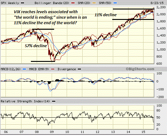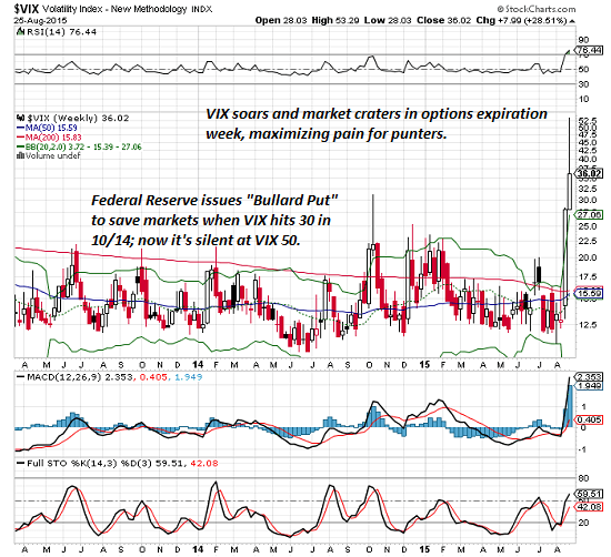 Direte voi, per quale ragione uno dovrebbe creare ad arte un crash azionario? Quali benefici ne ottiene? Parecchi, per pochi e a spese di molti, come quasi sempre. Prima di tutto, quanto accaduto lunedì è stato subito definito un “crash” azionario: signori, un calo dell’11% dai massimi storici non è qualificabile come “crash”. Guardate il primo grafico a fondo pagima, il quale ci mostra come l’indicatore di volatilità, il Vix, sia salito a livelli da fine del mondo, mentre l’indice Standard&Poor’s calava solo dell’11%: storicamente, il Vix a quota 50 è associato a cali di oltre il 20%. Quando il Vix salì sopra quota 50 nel 2008, il mercato terminò giù del 57%. Ora, invece, denominiamo quanto accaduto un “crash”. E ancora, i secondo grafico ci mostra come il Vix saliva e il mercato calava alla fine del cosiddetto Oex, “options expiration week”, di fatto massimizzando i danni, visto che durante le Oex di solito i mercati sono rialzisti e le eccezioni hanno a che fare con eventi enormi, tipo il fallimento di una grande banca d’affari. Quindi, volete farmi credere come una modesta svalutazione dello yuan, meno del 4%, fosse così “tail risk” e inaspettata, dopo che il peg yuan/dollaro è salito del 20% lo scorso anno? Un 4% di svalutazione equivale al fallimento, dalla sera alla mattina in stile Lehman, di una banca d’investimento? Credeteci, se volete.