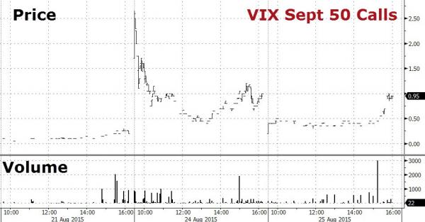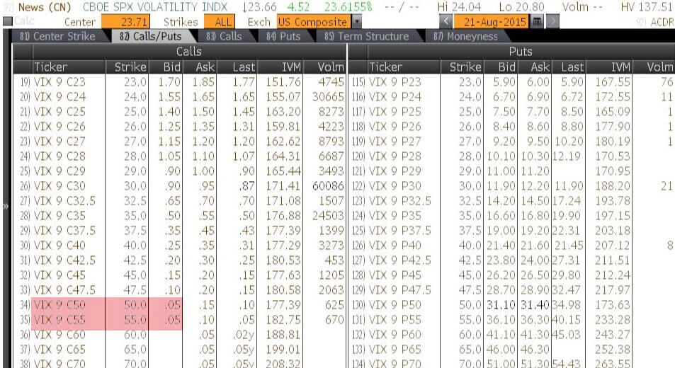 Come vedete, conviene ed è strumentale. Al bene di pochi e a spese di molti. Ma non basta, perché se è stato un crash organizzato, chi lo ha fatto non si è preoccupato di non lasciare prove in giro, sintomo che la disperazione finanziaria ed economica è tale da non temere letture eterodosse dell’accaduto da parte dei players. Venerdì pomeriggio della scorsa settimana, tre giorni prima del crash, il Vix stava già salendo e i titoli calavano e con un certo vigore. Casualmente, nelle stesse ore qualcuno stava comprando con il badile assicurazioni contro una potenziale catastrofe sui mercati, visto che all’ora di pranzo di Wall Street erano già state acquistate 625 opzioni call sul Vix Settembre 50 a un prezzo irrisorio, 10 centesimi come ci mostra la tabella a fondo pagina. Insomma, chi di colpo si svegliava con un appetito da leone per quelle opzioni sulla volatilità, era Nostradamus prestato al trading o sapeva qualcosa? Comprare quella quantità di opzioni call significava sapere di uno scostamento di mercato in stile Lehman, non temere un ribasso: si scommetteva sulla volatilità a 50, quando solo quattro giorni prima era a 11!