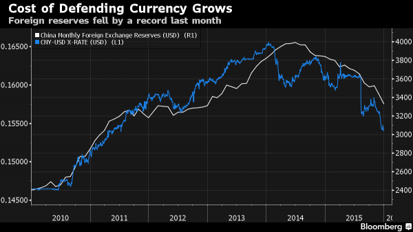Se non lo fa non c’è speranza di cavarsela. Il problema, lo ripeto, non è lo Shanghai Composite, ma il fatto che a dicembre le riserve estere cinesi sono calate molto più del previsto (come si nota nel primo grafico a fondo pagina), visto che sono passate da 3,438 triliardi di dollari a 3,330 triliardi, molto più dei 20 miliardi stimati all’inizio e tutto per cercare di difendere lo yuan.