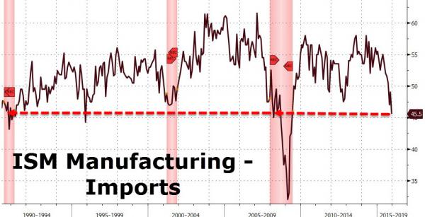 La seconda dinamica da mettere in preventivo è riassunta nel primo grafico a fondo pagina, ovvero il Baltic Dry Index collassato al minimo storico di 468, di fatto il costo dei noli per trasportare merci secche (non liquidi) sulle tratte asiatiche è zero, c’è una saturazione assoluta che porta quasi ad azzerare i costi dello shipping a fronte di consumi in netto rallentamento. Il secondo grafico, relativo all’import manifatturiero statunitense, ci conferma la dinamica in atto: tanto che Deutsche Bank parla chiaramente di una “tempesta perfetta” per le commodities secche che sta preparandosi all’orizzonte, con il miglioramento di fine anno che non si è palesato e le bancarotte che cominciano a crescere di numero.