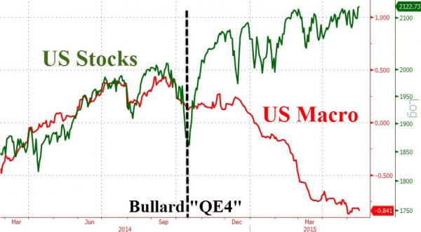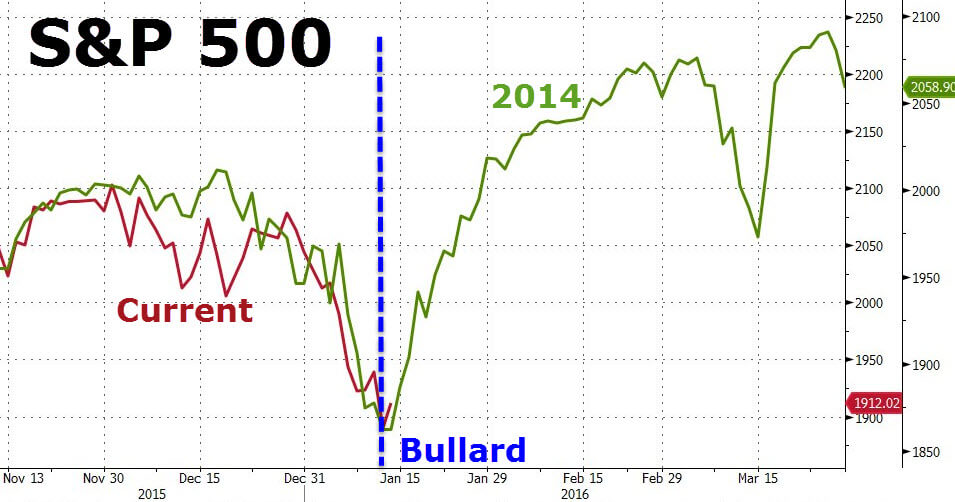 Nell’ottobre del 2014, quando la fine del Qe3 stava mandando pesantemente in correzione Wall Street, James B. Bullard, capo della Fed di St. Louis, saltò fuori dal nulla e avvertì il mercato che in caso di necessità la Federal Reserve sarebbe stata pronta a dare vita al Qe4. Boom! Il primo grafico a fondo pagina ci mostra cosa successe: i dati macro Usa andarono in continuo peggioramento, ma Wall Street evitò il tonfo e, anzi, innescò un altro mini-rally. Bene, lo scorso 13 gennaio lo stesso Bullard tornò alla ribalta e, nonostante la Fed avesse alzato i tassi dello 0,25% da meno di un mese, disse un’altra volta ai mercati di non andare nel panico, perché non era affatto detto che la politica di normalizzazione monetaria sarebbe stata veloce come annunciato dalla Yellen. Di più, se instabilità geopolitica internazionale e prezzo del petrolio avessero continuato a rafforzare il dollaro, danneggiando l’export Usa, si sarebbe potuto operare in altro modo. Il secondo grafico ci mostra quale fosse stato l’andamento di mercato fino al 13 gennaio, comparato con il precedente rally innescato da Bullard: come sappiamo, gennaio è stato il mese horribilis per le Borse. Insomma, la Bullard call questa volta non aveva funzionato.