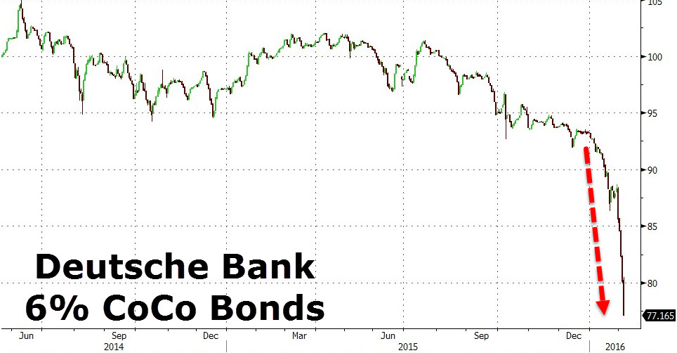 Qual è il problema? Primo, il gigante tedesco ha emesso prodotti derivati per 75 triliardi di dollari, 20 volte il Pil della Germania, oltre 5 volte il Pil della zona euro e quattro abbondanti il debito pubblico americano. Capite da soli che un’insolvenza travolgerebbe le controparti di mezzo mondo. Di più, per raccogliere denaro Deutsche Bank ha cominciato a emettere junk-bonds travestiti da CoCo Bonds, Convertible Contingent Bonds: si tratta di obbligazioni ibride convertibili che, in determinate condizioni, si trasformano in azioni, quindi in capitale della banca che li ha emessi, alleggerendone sostanzialmente l’esposizione debitoria. Questi titoli vengono convertiti in azioni solo se il Tier 1 (il coefficiente che indica il livello di patrimonializzazione) della banca che li ha emessi scende sotto la soglia del 5%. Parliamo di un controvalore di emissione da 6,4 miliardi di dollari, casualmente cifra simile ai 6,7 miliardi di dollari che è stata la perdita netta di Deutsche Bank nel 2015: voleva evitare un aumento di capitale decisamente problematico vendendo immondizia ai clienti, stile Banca Etruria ma in grande?