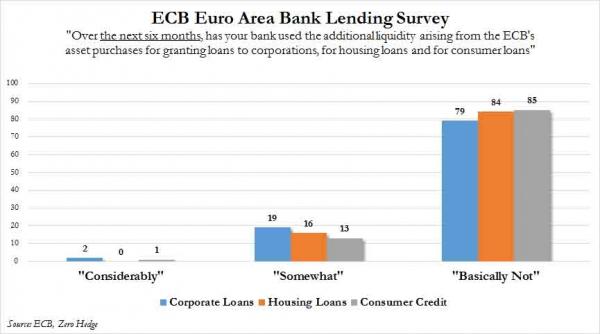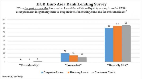 Andiamoci piano, perché a dire che il Qe di Mario Draghi non serva a nulla, se non a calmierare artificialmente gli spread sovrani (evitando danni alle già disastrate banche che li detengono con il badile) e a sostenere gli indici di Borsa, sono le stesse banche europee che la Bce ha interpellato per il suo sondaggio interno e che hanno offerto tutte la stessa risposta: il Qe non ha alcun impatto sulla nostra operatività, nella fattispecie sui prestiti all’economia reale, l’unico vero driver potenziale della ripresa. Ecco la domanda posta a pagina 46 del documento di 54 pagine della Bce: «Negli ultimi sei mesi, la tua banca ha utilizzato la liquidità addizionale ottenuta attraverso il programma di acquisto della Bce per garantire prestiti ad aziende, mutui immobiliari o prestiti legati al consumo?». Risposta? Ce la mostrano questi due grafici: lo 0% degli interpellati ha risposto “considerevolmente”, mentre tra l’80% e il 90% ha riposto “basicamente no”.
