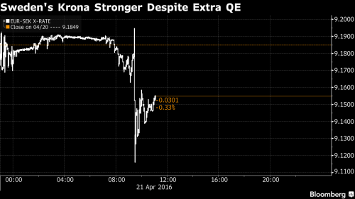 Tutta colpa dei tedeschi? No, ve lo garantisco. Perché è l’impianto della politica di stimolo basata su tassi a zero o negativi a essere ontologicamente sbagliato e mendace e ce lo conferma anche la Riksbank, ovvero la Banca centrale svedese, la quale poche ore prima che Draghi prendesse la parola ha stupito il mondo ampliando ancora il suo programma di Qe di altri 45 miliardi di corone nel secondo semestre di quest’anno, di fatto monetizzando anche i fiordi. Risultato e reazione del mercato? Quella che vedete nel grafico: corona in apprezzamento, esattamente il contrario di quanto la Riksbank vorrebbe ottenere con le sue azioni. Ma, si sa, se si invita il mercato ad andarefront-load con i tuoi acquisti, la valuta si apprezza e la bolla immobiliare si espande: non ci vuole un laureato ad Harvard. Peccato che mezzo mondo pensi il contrario e, purtroppo, i risultati di questa ubriacatura keynesiana da stimolo sono ben visibili agli occhi di tutti. Tranne, ovviamente, a quelli che non vogliono vedere. Se, come immagino, le aste Tltro2 si riveleranno un sontuoso fallimento, allora avremo la certezza che l’intero impianto messo in piedi da Draghi è destinato a fallire: peccato che potrebbe essere qualche Paese della periferia dell’eurozona a fargli compagnia, condividendone il destino.
