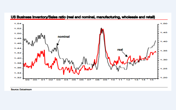 Ad aprile l’aumento su base annua è stato del 9,6%, il maggiore dal 1982. Per Albert Edwards di Societe Generale, il vero segnale d’allarme è quello rappresentato in questo grafico, ovvero l’aumento della ratio tra scorte di magazzino e vendite, oggi a un livello tale da far rivedere i piani produttivi alle aziende, soprattutto quelle dell’abbigliamento e del settore automobilistico. Per Edwards, «le recessioni sono causate dal ciclo di investimento del business. La continua crescita delle scorte è una spada di Damocle che pende sempre più pericolosamente sulla testa degli investitori, visto che i profitti svaniscono e cominciano le liquidazioni».