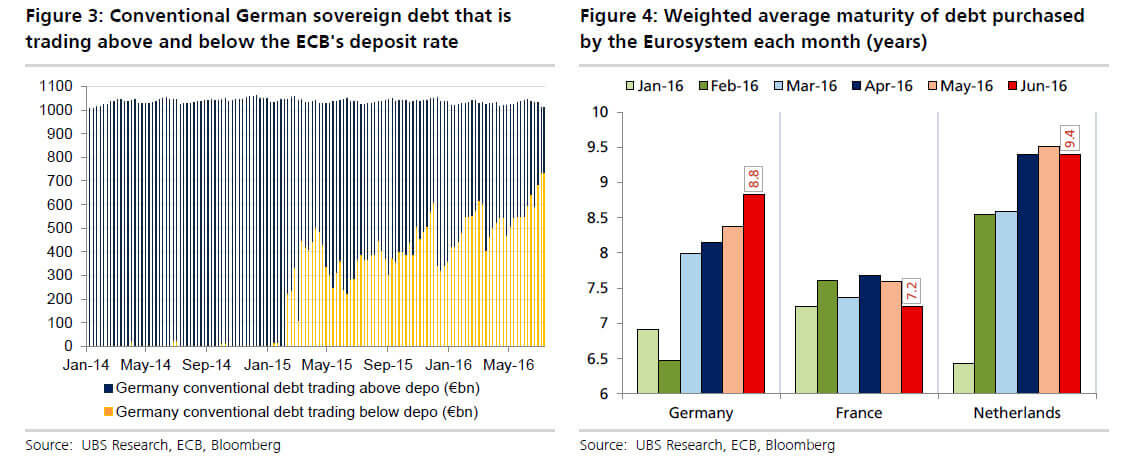 Occorre cambiare i criteri di acquisto e questo è il nodo, visto che la realtà stride pesantemente con quanto detto dallo stesso Draghi soltanto un mese fa, quando parlò «di ampia liquidità»: non è così, perché le securities con rendimento al di sotto del floor della Bce per gli acquisti, -0,40%, sono cresciute del 60%, stando alla valutazione sul Bloomberg German bond index, il cui controvalore è di 1,13 triliardi di euro. E come ci mostra il grafico 3 a fondo pagina, questo significa che non sono eligibili all’acquisto da parte della Bce: dipende tutto dai criteri ed esiste un rischio che, se i rendimenti del Bund continueranno a calare, un primo shortage si abbia già durante gli acquisti agostani.