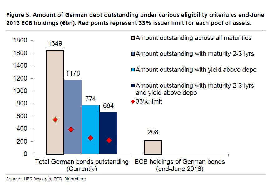 Errore di valutazione in fase di preparazione del Qe? No, scelta volontaria per non mostrare subito ai mercati quanto la situazione fosse grave e quanto la Bce fosse costretta a comprare per mantenere la carreggiata: ora, però, sono i problemi tecnici del mercato a farsi vivi. E quelli non si possono né nascondere, né ignorare. L’ultimo grafico ci mostra come si amplierebbe la pool di bond eligibili all’acquisto se soltanto la Bce abbandonasse il floor del tasso di deposito, mantenendo inalterate tutte le altre regole, come il range 2-31 anni sulla maturity delle obbligazioni: al ritmo attuale, potrebbe comprare bond tedeschi per altri 11 mesi, garantendosi un grosso sospiro di sollievo. Il problema è che dopo il non annuncio al riguardo di ieri da parte di Mario Draghi, il rendimento del Bund a 10 anni è tornato sotto zero e la tendenza non è affatto quella di un rialzo degli yields lungo tutta la curva.