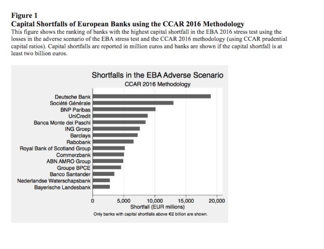 Come ci mostra il grafico a fondo pagina, tra gli istituti più colpiti ci sono Deutsche Bank, la quale nello scenario più avverso avrebbe bisogno di un’iniezione di capitale pari a 19 miliardi di euro, al netto di una capitalizzazione che oggi è di appena 17 miliardi, Societe Generale con 13 miliardi e Bnp Paribas con 10 miliardi. Mentre in quarta e quinta posizione, troviamo le nostre Unicredit e Monte dei Paschi, le quali necessiterebbero rispettivamente di 8,8 miliardi e 8,5 miliardi di euro. Occhi puntati quindi su Francia e Germania, dove continua a impazzare il dibattito sull’adeguatezza patrimoniale di Deutsche Bank e diventano sempre più insistenti le voci di una sua nazionalizzazione forzata.
