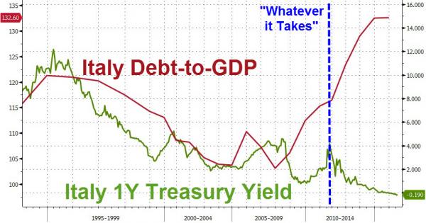 Mercoledì, infatti, come ci mostra il grafico qui sotto, l’Italia ha venduto debito a 12 mesi per 6 miliardi di controvalore con un rendimento di -19 punti base. Pensate che questa farsa potrà durare in eterno?