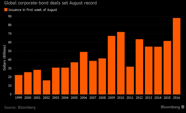 Ma non basta. Perché non solo viviamo in un mondo con un sistema bancario europeo quantomeno intossicato ma, grazie alle Banche centrali, anche nel paese delle meraviglie di Alice. Il grafico più in basso, elaborato su dati di Bloomberg, ci dice come nella prima settimana di agosto, a livello globale, le aziende si siano indebitate tramite emissioni obbligazionarie per qualcosa come 98 miliardi di dollari, il massimo dal 1999, primo anno in cui sono cominciate le rilevazioni. In spolvero la Gran Bretagna, visto che Bmw, Hsbc e la bocciata Bnp Paribas hanno emesso carta per 2,1 miliardi lunedì scorso, questo dopo il diluvio obbligazionario statunitense che ha visto Berkshire Hathaway annunciare l’emissioni di debito per 2 miliardi di dollari in quattro tranche, mentre alla Archer-Daniels-Midland si sono limitati a 1 miliardo a dieci anni.