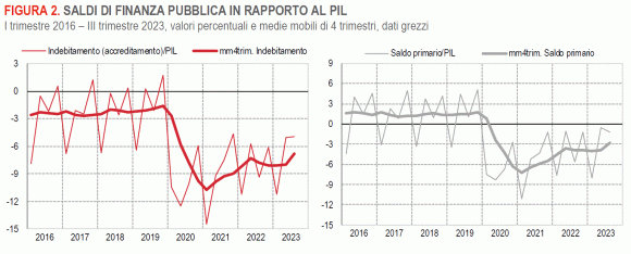 Osservando i numeri delle cosiddette Amministrazioni Pubbliche (AP) si rileva che nei primi nove mesi del 2023 hanno registrato un indebitamento netto pari al -7,1% del Pil ovvero in miglioramento rispetto al -8,8% del corrispondente periodo del 2022. Complessivamente è un buon dato.