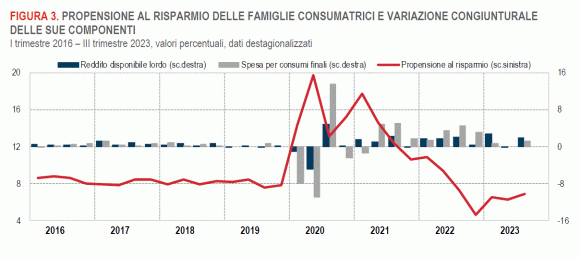 Ora, invece, diamo la parola alle famiglie consumatrici che nel terzo trimestre 20223 hanno avuto un reddito in aumento, una spesa maggiore poiché pagata meno e, udite, udite, anche risparmiato (addirittura). Dire benessere è dire poco. Leggiamo: «Nel terzo trimestre 2023 il reddito lordo disponibile delle famiglie consumatrici è aumentato dell’1,8% rispetto al trimestre precedente. A fronte di un aumento del deflatore implicito dei consumi pari allo 0,5%, il potere d’acquisto è aumentato dell’1,3%». Continuando: «Nel terzo trimestre 2023 la propensione al risparmio delle famiglie consumatrici è stata pari al 6,9%, in aumento di 0,6 punti percentuali rispetto al trimestre precedente. Tale aumento deriva da una crescita nominale della spesa per consumi finali meno sostenuta rispetto a quella registrata per il reddito lordo disponibile (+1,2% e +1,8%, rispettivamente, in termini nominali)».