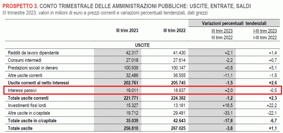 Si tratta della tanto e temuta voce “Interessi passivi” che, nell’aprile scorso, non ci ha proprio convinti. Di per sé, questi 19 miliardi di euro potrebbero rappresentare un’inezia, ma se raffrontati ai loro valori storici una qualche perplessità (preoccupazione) sovviene. Infatti: rispetto al terzo trimestre dello scorso anno (18.637 milioni) risultano in aumento, così come, rimanendo sempre al terzo trimestre degli anni scorsi, consultando l’intera serie (dal 2010) messa a disposizione da Istat (rif. Tavola 4.1a) si possono osservare solo cifre inferiori che, pertanto, confermano i “solo” 19 miliardi quale nuovo record (negativo).