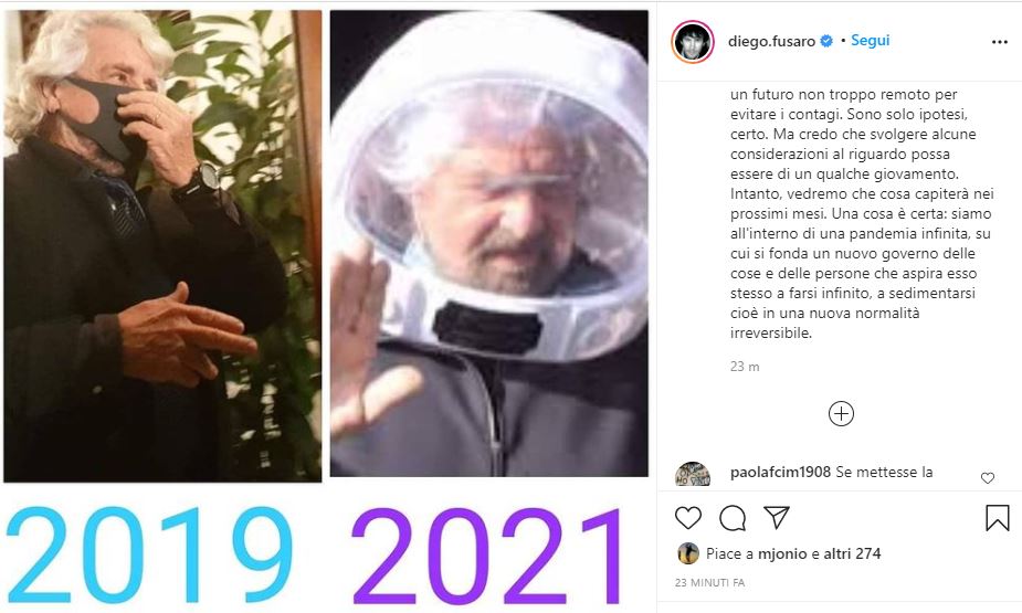 Pubblicando uno scatto in cui si vede Beppe Grillo già nel 2019 con la mascherina e quindi nel 2021 con il casco, scrive: “È il 2019, e Beppe Grillo si mostra in pubblico, in tempi davvero non sospetti, con una mascherina protettiva. Afferma che serve a proteggerlo dal virus dei giornalisti. Dopo pochi mesi sappiamo quel che accade: la mascherina protettiva diventa l’uniforme obbligata del nuovo ordine terapeutico”.