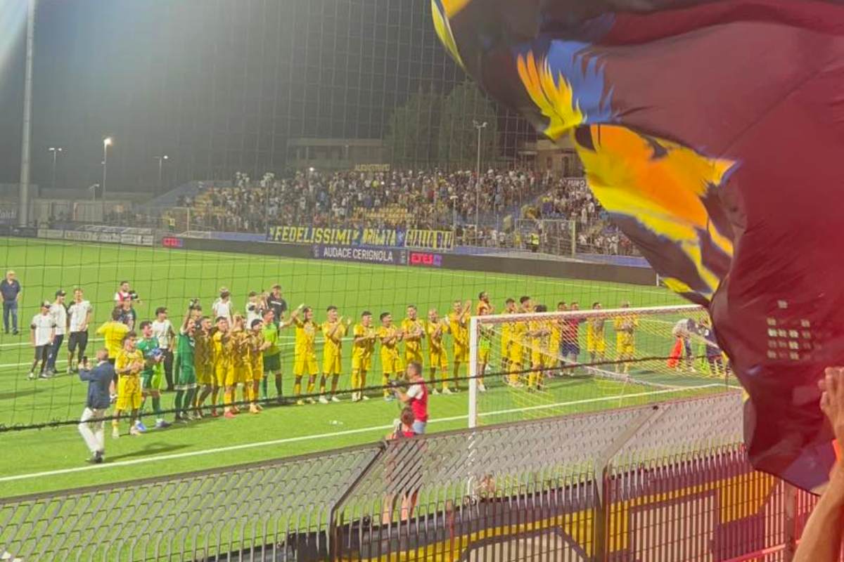 L'Audace Cerignola esulta con i suoi tifosi (da Facebook)