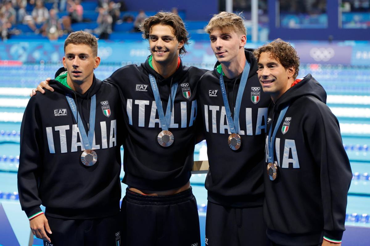 La 4x100 del nuoto maschile con l'argento mondiale (Foto ANSA)