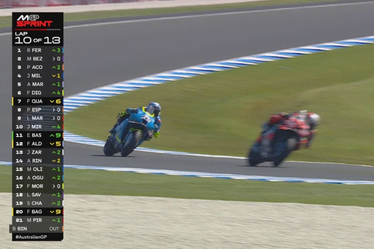 Il pilota romagnolo ha chiuso con la sua Aprilia davanti a tutti, precedendo il giovane talento spagnolo Pedro Acosta e quindi Miller. Fuori dal podio invece Di Giannantonio, davanti ad Alex Marquez su Ducati Gresini quinto e poi Quartararo sesto e Luca Marini. Malissimo invece Pecco Bagnaia che dopo delle prove libere e delle qualifiche disastrose ha chiuso solamente in diciannovesima posizione, quindi al penultimo posto: così facendo rischia di perdere il terzo posto in classifica. Ricordiamo che prima della Gara Sprint si sono tenute questa notte le qualifiche (valevoli anche per il Gp vero e proprio di domani), che hanno visto la pole position di Quartararo davanti a Bezzecchi, quindi Miller su Yamaha e Fernandez su Aprilia. Male Bagnaia, che partirà 14esimo dopo essere stato retrocesso in griglia per aver ostacolato nel suo giro di lancio il connazionale che oggi ha vinto la Sprint. (aggiornamento di Davide Giancristofaro)