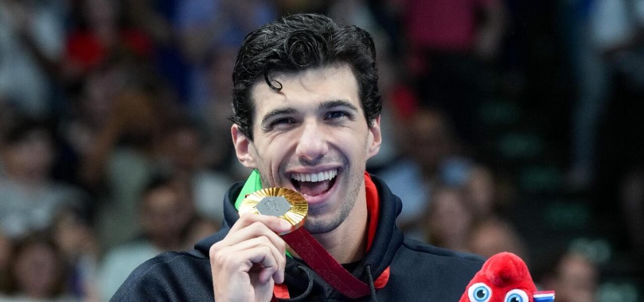 Simone Barlaam con la medaglia d'oro alle Paralimpiadi Parigi 2024 (Foto ANSA)