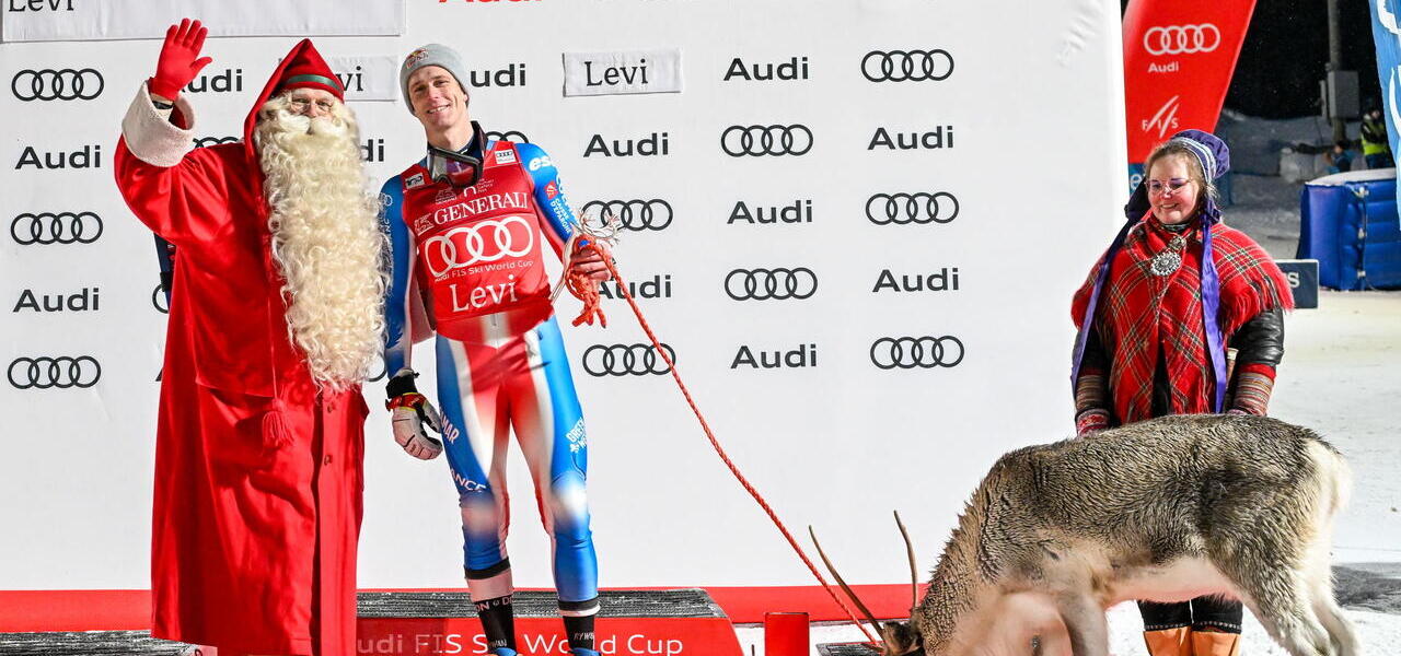 Clement Noel dopo la vittoria dello slalom di Levi (Foto ANSA)
