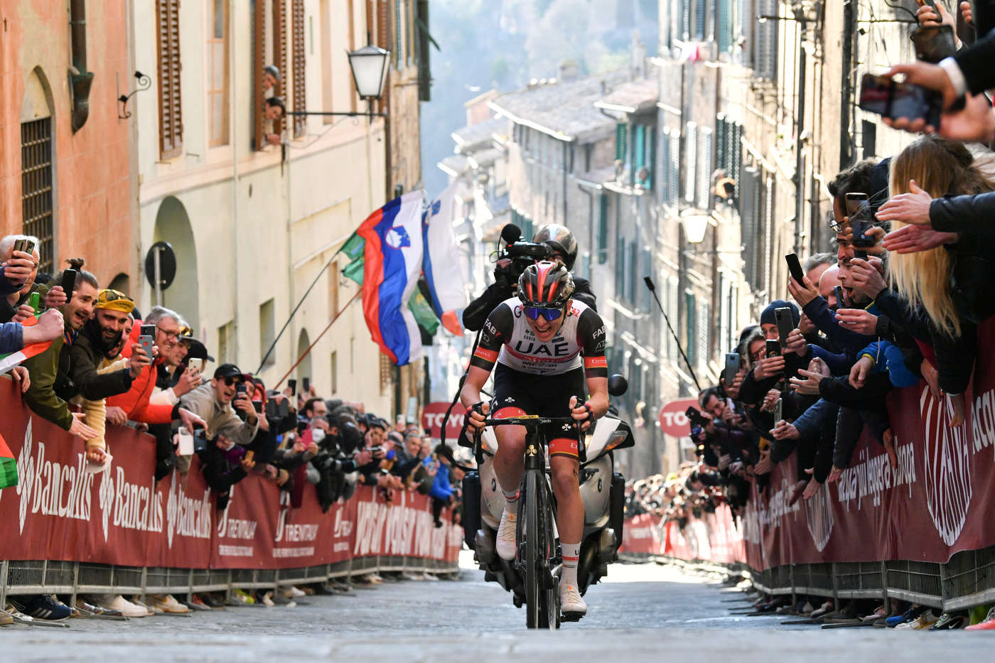 Ne abbiamo naturalmente già accennato, tuttavia in attesa della diretta della Strade Bianche 2023 bisogna ancora celebrare il capolavoro compiuto l’anno scorso da Tadej Pogacar sulle strade di Siena e dintorni – mentre purtroppo ricordiamo che stavolta il campionissimo sloveno della UAE Team Emirates sarà il grande assente alla Strade Bianche 2023, al pari di Wout Van Aert. Torniamo comunque con la memoria a un anno fa, perché nessun tifoso o appassionato di ciclismo può aver dimenticato cosa fece Tadej Pogacar sabato 5 marzo 2022. L’attacco dello sloveno arrivò addirittura ad oltre 50 km dall’arrivo in Piazza del Campo, cioè all’inizio del lunghissimo tratto sterrato di Monte Sante Marie.