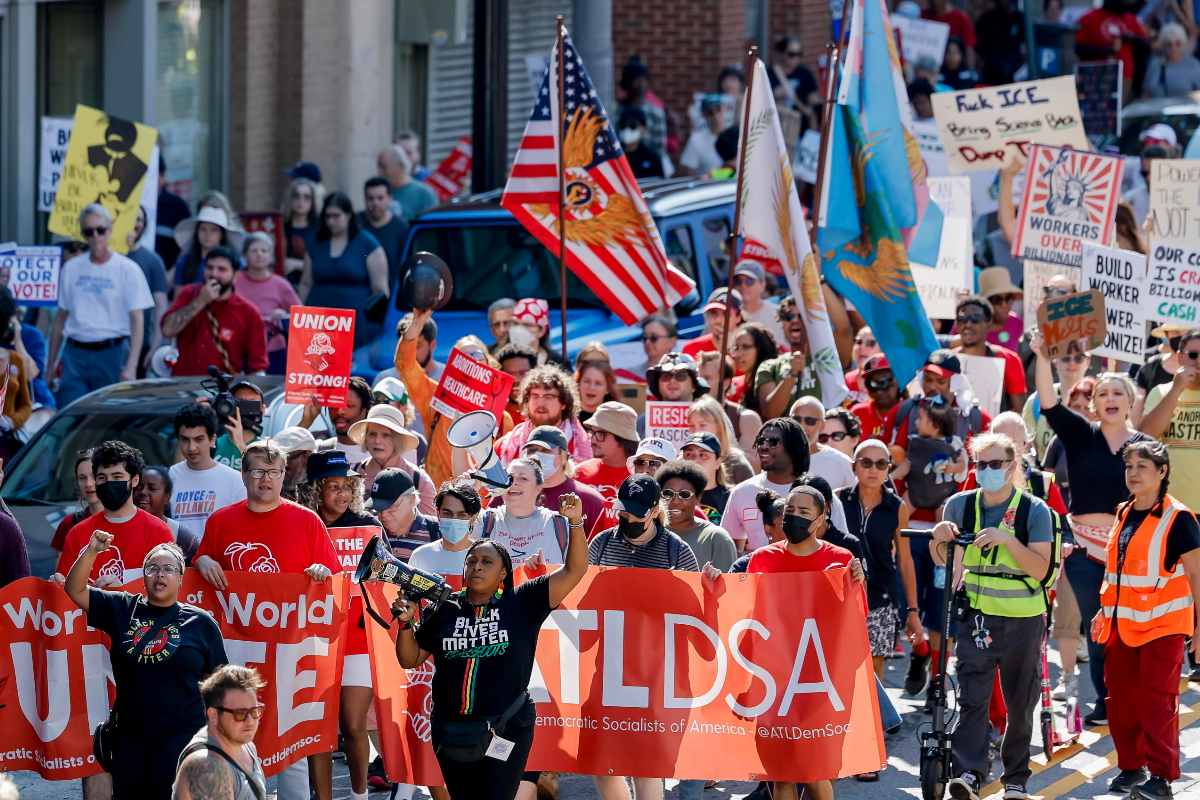 Atlanta, Georgia (USA). Dimostranti durante la festa del Labor Day, 1 settembre 2025 (Ansa)