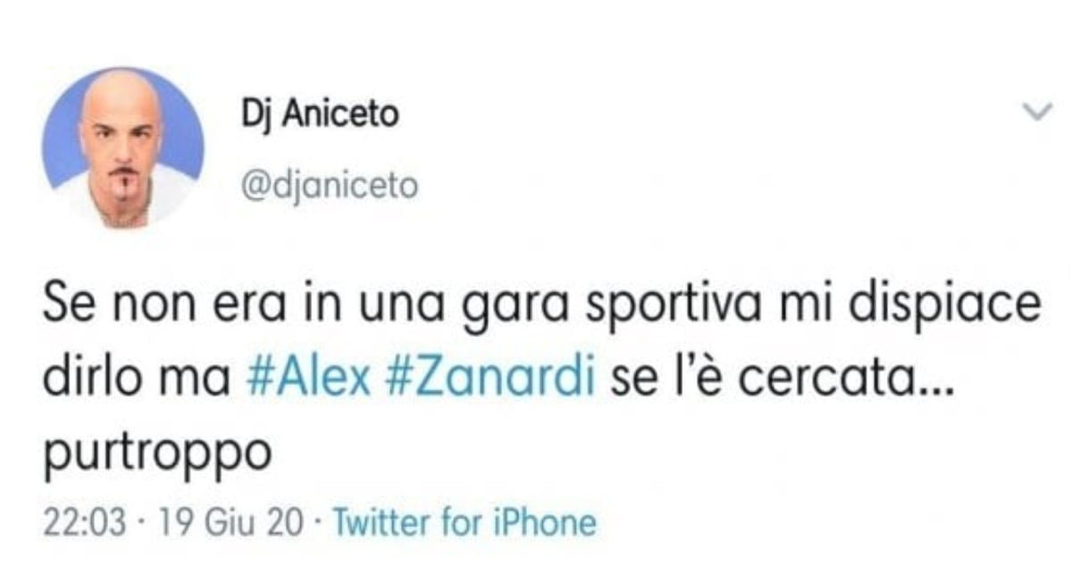Il noto Dj Aniceto è stato preso di mira nelle scorse ore per un tweet pubblicato nei confronti del povero Alex Zanardi, vittima di un terribile incidente nel pomeriggio di venerdì. Subito dopo che è circolata la notizia, Aniceto ha scritto sul social: “Se non era in una gara sportiva mi dispiace dirlo ma Alex Zanardi se l’è cercata, purtroppo”. Un cinguettio che in breve tempo aveva fatto il giro del web, attirando le ira degli hater, che avevano poi subissato di insulti Aniceto. Il Dj è stato quindi costretto a cancellare il post, facendo mea culpa e chiedendo scusa: “Ho capito che ho fatto una grande str… a scrivere quel tweet – le parole rilasciate subito dopo il fattaccio, ai microfoni dell’agenzia Adnkronos – chiedo davvero scusa a tutti. Sono veramente dispiaciuto, me ne sono subito pentito, ho cercato di cancellarlo, ma è stato inutile, purtroppo ho visto che molti lo avevano già fotografato”. Aniceto ha spiegato di essere una persona che “lancia spesso provocazioni”, per “attirare l’attenzione su alcuni concetti”, per poi aggiungere: “Siccome lì per lì mi sono arrabbiato, pensando che si trattasse di una gara amatoriale, ho pensato a quest’uomo che va sempre oltre ogni limite e mi sono chiesto il perché. Ma siccome sono un cretino, uno che fa le cose d’impeto, ho scritto questa str…., una cosa davvero brutta”.