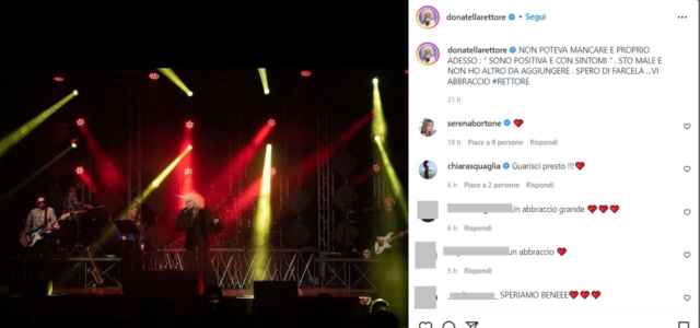 Con un post su Instagram, Donatella Rettore annuncia di essere positiva al covid e di dover interrompere il tour: "Sto male, spero di farcela".