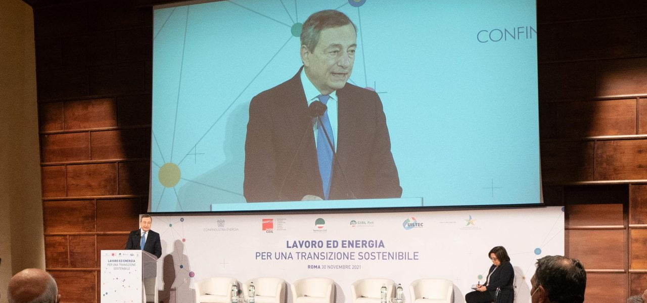 Mario Draghi all'evento su Energia e Lavoro (LaPresse, 2021)