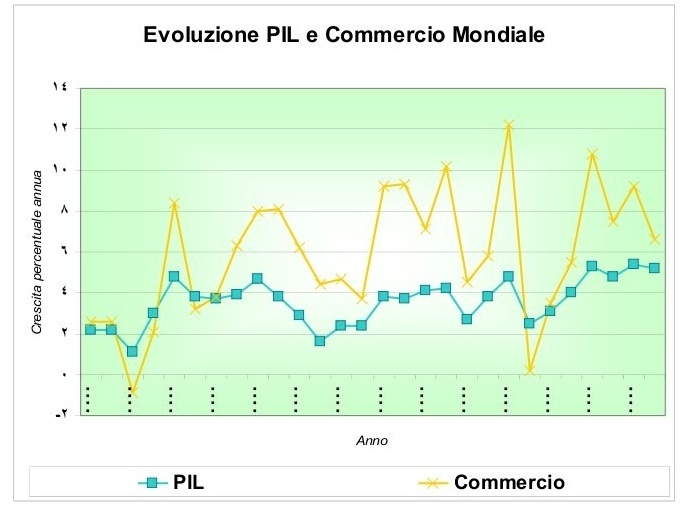 Si evidenzia che il commercio internazionale nei periodi di espansione economica cresce più velocemente del PIL, mentre nei periodi di rallentamento dell’economia si ha una decelerazione degli scambi internazionali. Spiegazioni più approfondite possono essere trovate nell’ottimo libro di Giuseppe Schlitzer “Il fondo monetario internazionale”.