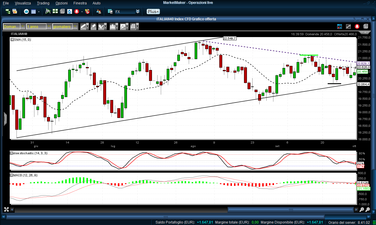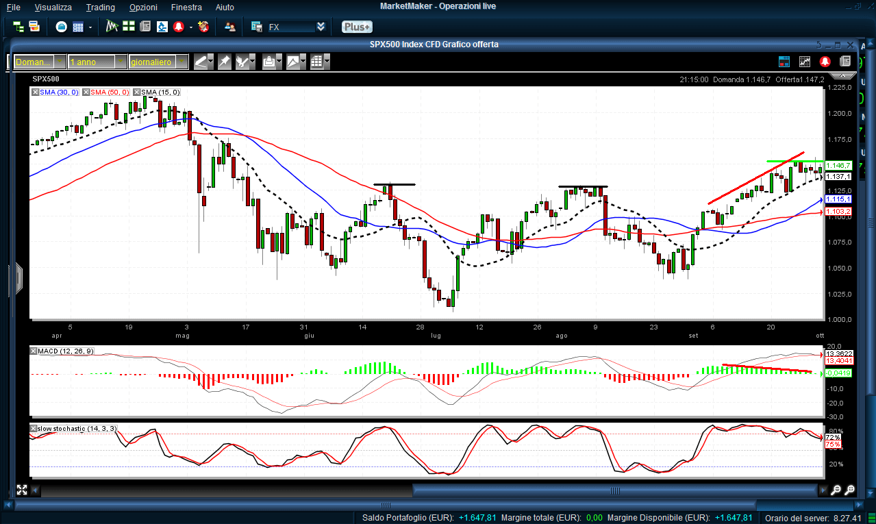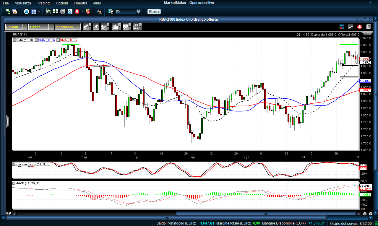 Anche per il listino tecnologico permane il quadro tecnico della scorsa settimana: oramai sono a portata di mano i massimi di aprile 2010 in area 2.050 punti, il tutto sostenuto dalle medie mobili, da massimi e minimi crescenti (segnali evidenti di un trend rialzista). Il MACD che nel medio periodo sostiene l’uptrend, nel breve si sta indebolendo, lo STOCASTICO non mantiene area 80 ed è quindi un altro segnale di debolezza. I supporti da tenere in evidenza sono area 1,130 e 1,120, mentre un superamento di area 2,050 porterebbe a nuovi scenari rialzisti (ma rimaniamo cauti….).