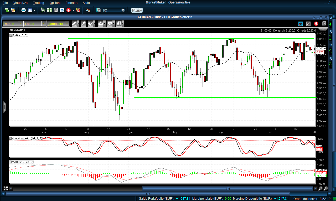 Come chiaramente visibile dal grafico, il DAX non riesce oramai da diversi mesi a superare la forte resistenza statica 6,350. Piuttosto potremmo dire che l’ampio range di lateralità tra 5,800 e 6,300 punti, ci fa intendere come la situazione sul più forte mercato europeo non sia per niente facile. Solo il superamento rialzista della resistenza a 6,350 ci farebbe considerare la possibilità di continuazione rialzista, mentre sotto area 6,130 il primo obiettivo short da considerare sarebbe area 6,000.