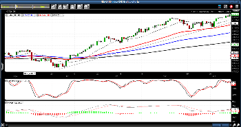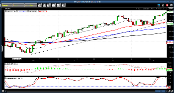 Identica situazione per l’indice tecnologico che continua a mantenere il suo trend positivo e non da segni di indebolimento. I prezzi sono stabilmente sopra le MM 50, 100 e 200 e gli oscillatori MACD e Stocastico si confermano a vicenda.