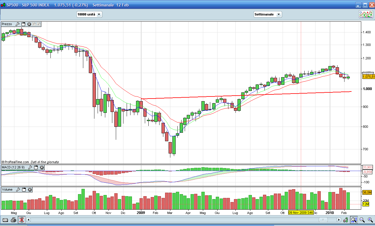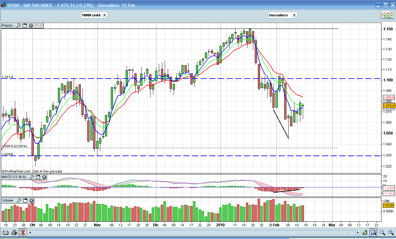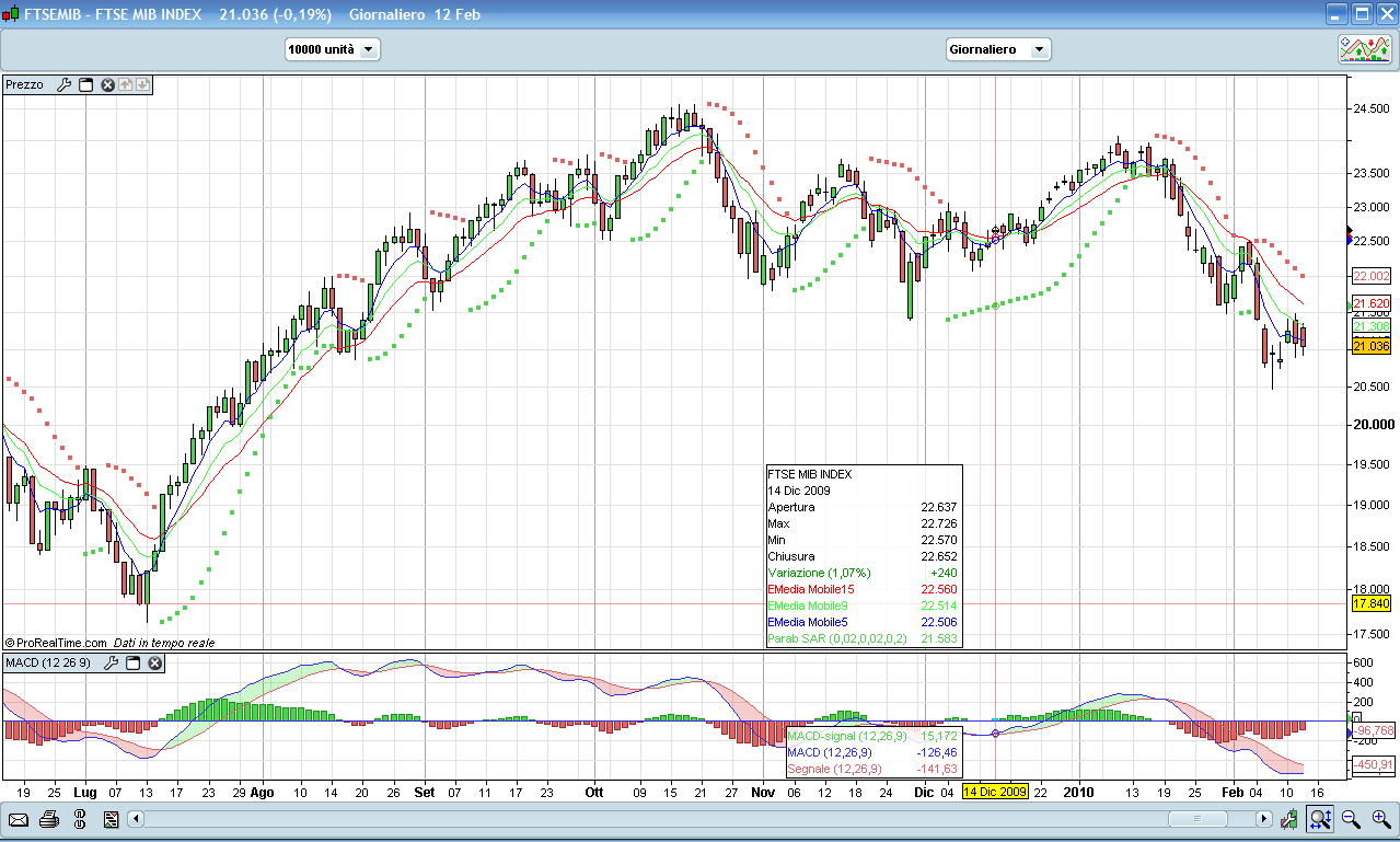 Anche per l’indice italiano il quadro tecnico non da segni confortanti, anzi abbiamo diversi segnali che possono far pensare a una continuazione del trend negativo. Sul lungo periodo MACD, Parabolic SAR, MM, sono in posizione ribassista, mentre nel breve periodo notiamo divergenza bullish MACD-prezzi che potrebbe dare adito a un rimbalzo nella prossima settimana. I massimi e minimi decrescenti ci dicono che comunque il trend anche nel breve rimane impostato al ribasso; conferme da MACD, PARABOLIC SAR, MM.