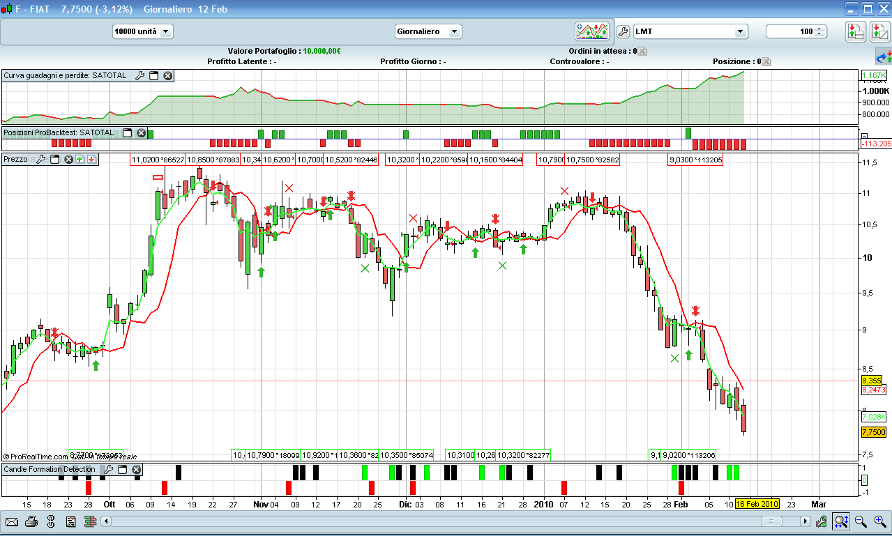 Continua il nostro shortone su FIAT che ormai ci sta dando guadagni a due cifre. Le medie mobili con la gestione della posizione basata sui pattern delle candele ci permette di continuare a seguire il trend al ribasso. La statistica ci aiuta a prendere coraggio e seguire i nostri segnali operativi senza tentennamenti.