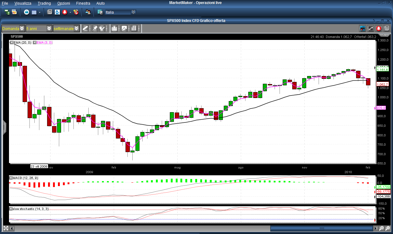 La settimana appena trascorsa ha visto in forte calo le principali piazze finanziarie. A pesare sui listini sono stati in modo particolare i dati macroeconomici, soprattutto quelli sulla disoccupazione, ma anche i timori relativi al debito di alcuni Paesi europei, primo tra tutti la Spagna. Le richieste di sussidio alla disoccupazione negli Usa hanno registrato un incremento a 480.000 unità nell’ultima settimana, deludendo gli analisti che si attendevano un calo a 460.000 unità dalle 472.000 (dato rivisto) del mese precedente. Anche la lettura della produttività relativa al quarto trimestre si è rivelata inferiore alle attese, attestandosi comunque a +6,2% (su base annua l’incremento è stato del 2,9%, miglior dato dal 2003). Andiamo a vedere cosa ci dicono i grafici.