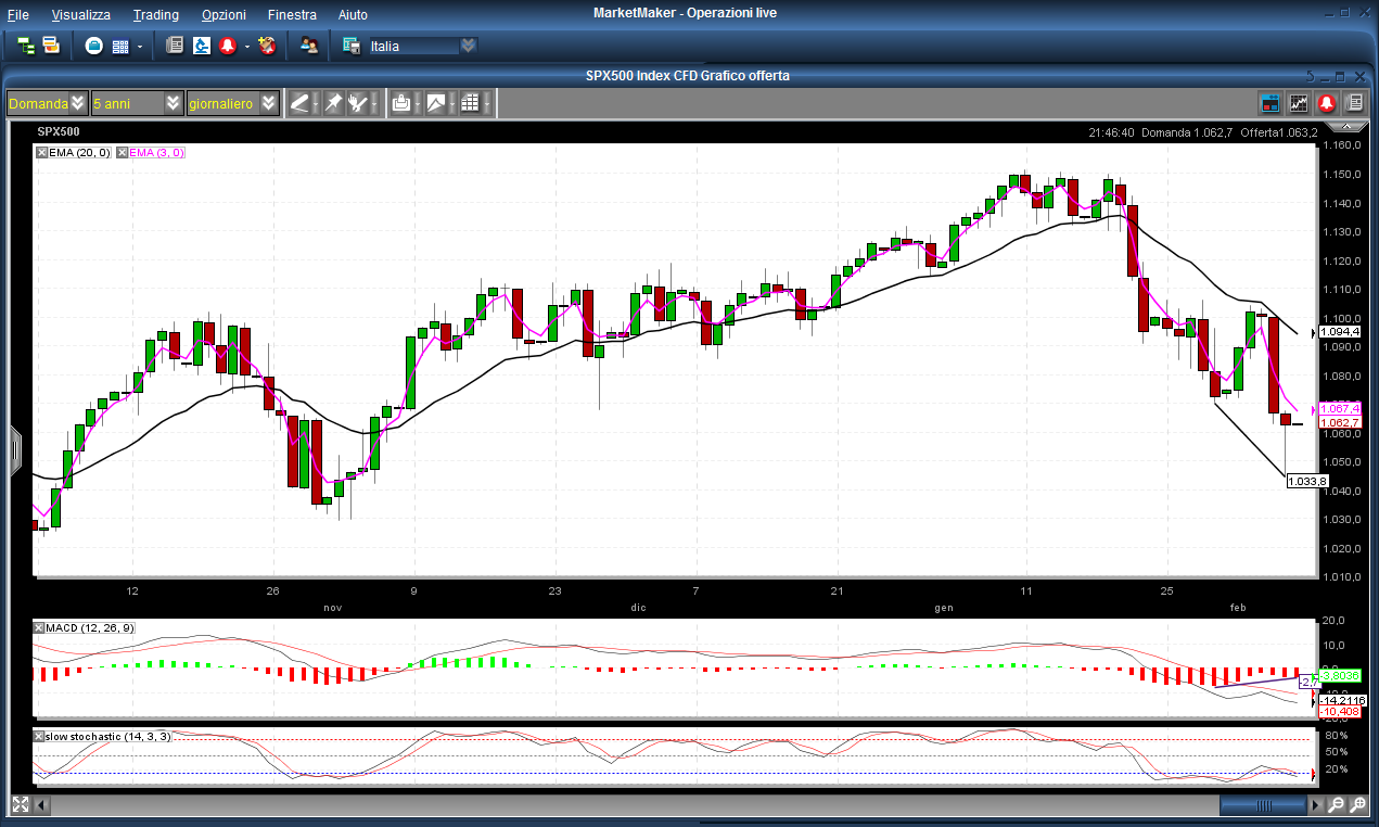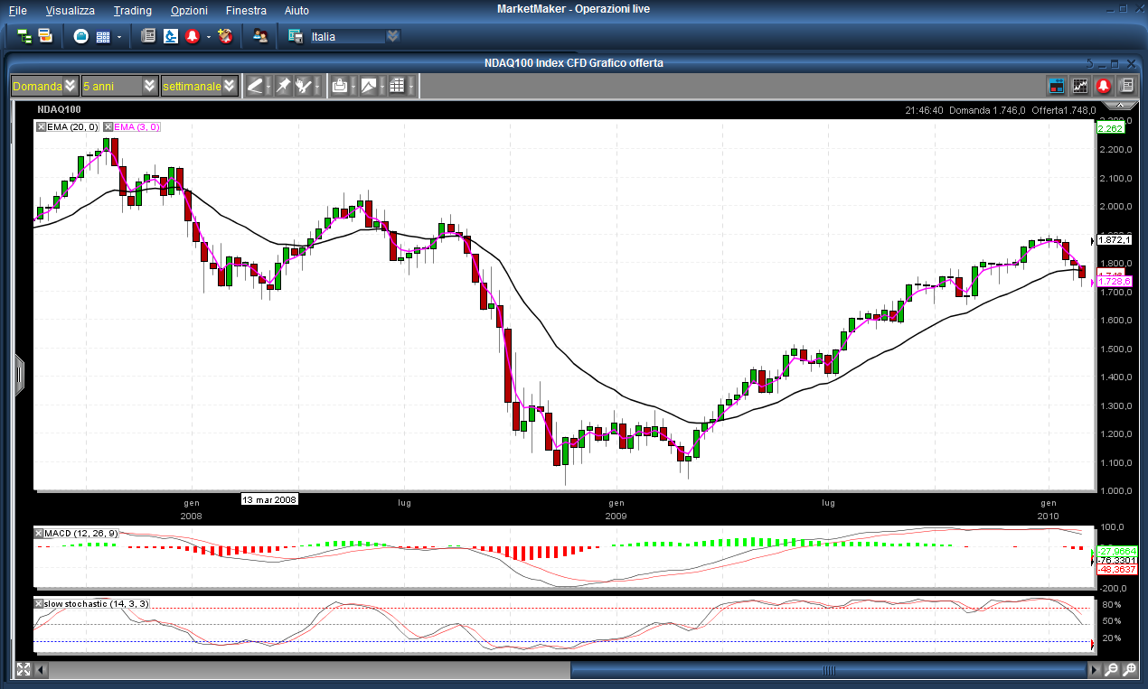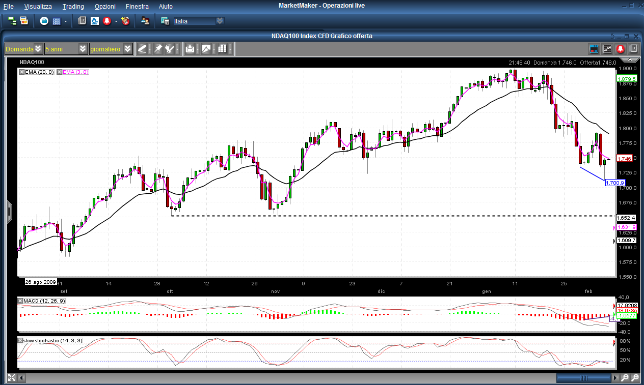 Anche per il listino tecnologico il quadro tecnico non è per niente rassicurante. I grafici ci mostrano chiaramente l’impostazione ribassista delle ultime due settimane. I prezzi hanno raggiunto il primo obiettivo da noi evidenziato a 1,700 punti, aprendo così uno scenario chiaramente ribassista. Sia nel Lungo che nel breve periodo le MM sono in posizione SHORT, il MACD e lo Stocastico confermano la presenza del trend ribassista. Per un trading di breve evidenziamo una leggera divergenza rialzista prezzi-MACD che potrebbe portare ad un momentaneo rimbalzo dei prezzi per poi continuare con trend ribassista. Primo target 1,660-1,650 inversione sopra 1,792.
