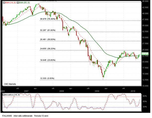 Unendo i massimi del maggio 2007 a 44.576 punti con i minimi del marzo 2008 a 13.327, ci accorgiamo che l’indice italiano si trova sotto il 38.20% del ritracciamento di Fibonacci, livello che effettivamente è stato toccato nell’ottobre 2009 a 24.558 per poi iniziare un leggero storno “fisiologico”.