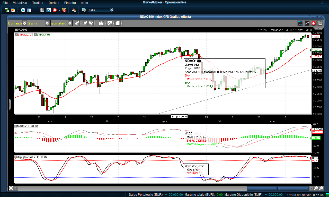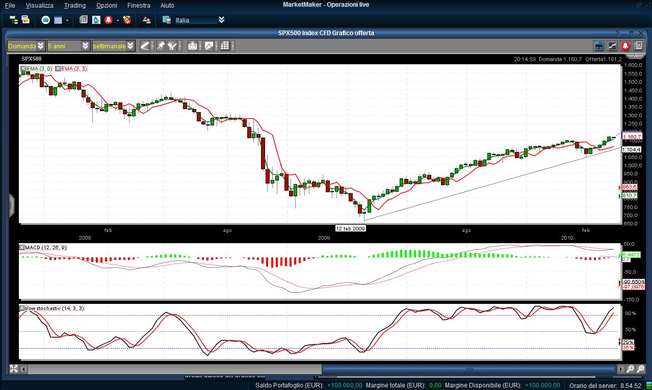 Il listino americano è inquadrato in ottica rialzista sia nel lungo che nel medio termine, mentre nel breve periodo ci evidenzia una certa debolezza del trend che potrebbe portare ad una ulteriore correzione dei prezzi la prossima settimana. Infatti si evidenzia divergenza bearish tra e prezzi, mentre comunque lo stocastico conferma l’esistenza del trend.