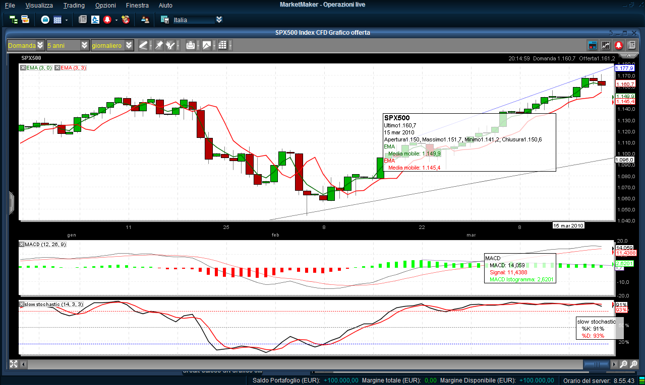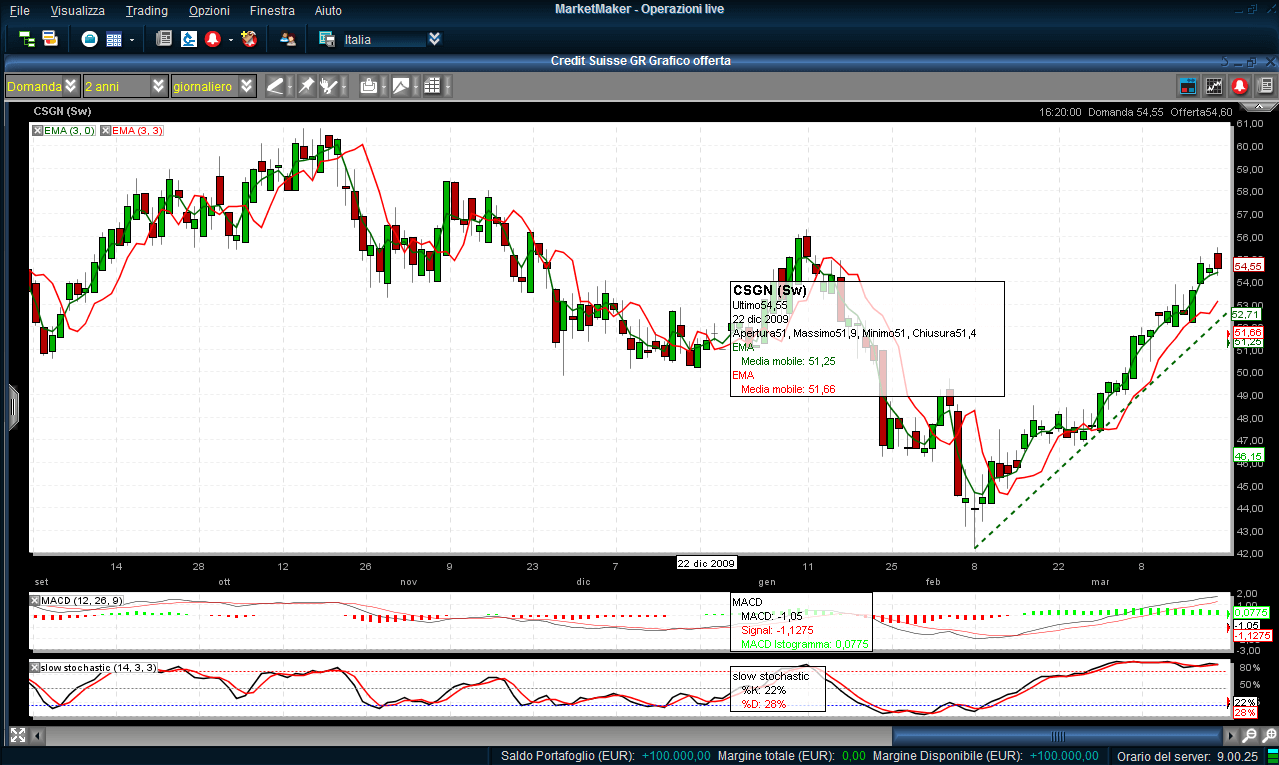 Settimana scorsa avevamo detto “Ci aspettiamo dunque una prosecuzione del trend per la settimana prossima con obiettivi a 56CHF con stop a 50CHF (possibile inversione su break out di tale livello)” (il punto 15marzo), ed in effetti i prezzi hanno spinto al rialzo fino quota 55,50 molto vicino al nostro primo obiettivo. Come si vede dal grafico effettivamente il titolo bancario è in questo momento inquadrato in ottica rialzista con conferme tra MACD e Stocastico. Possibili prese di beneficio per poi aspettarci una prosecuzione del trend principale.