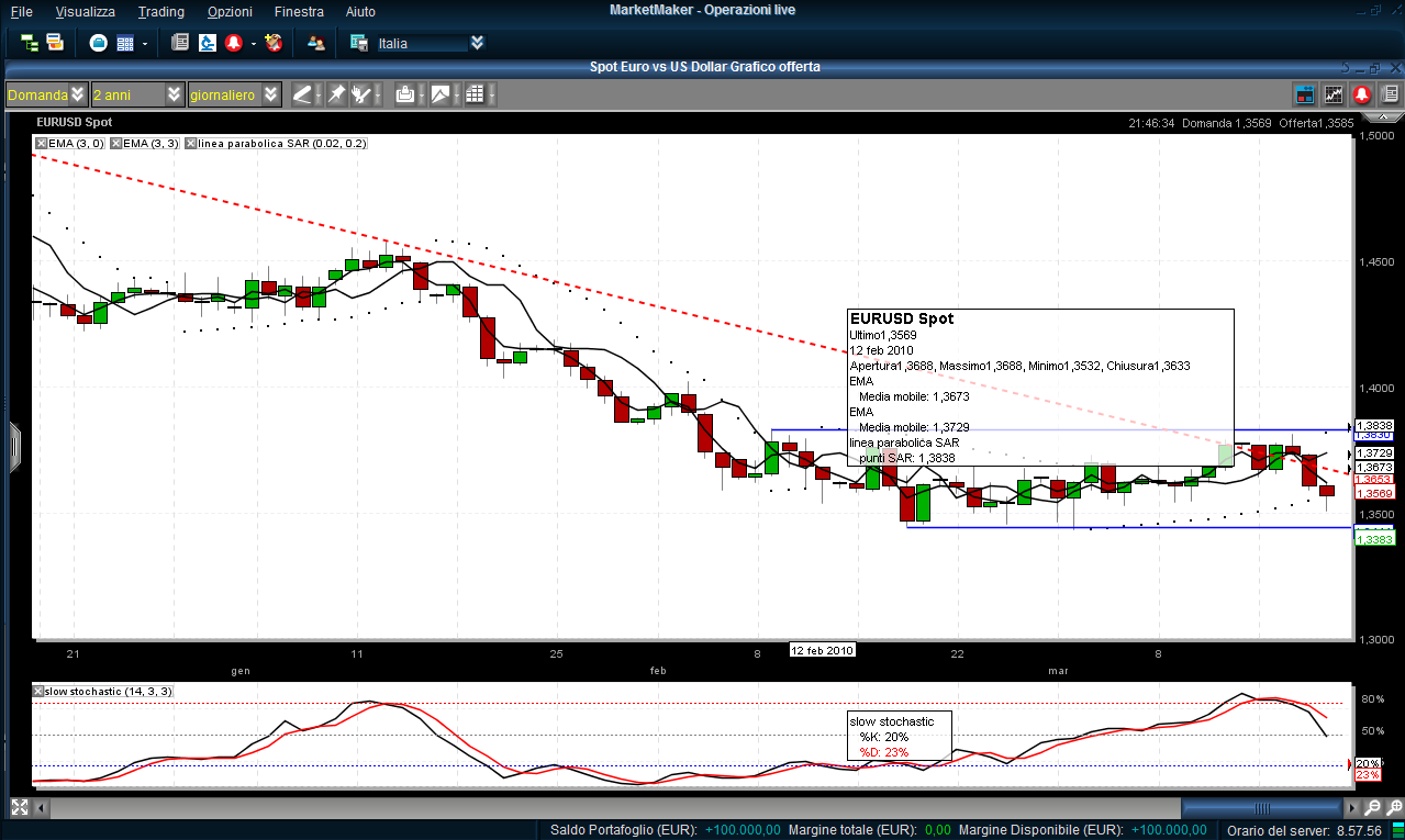 Inserito chiaramente in ottica ribassista, il cross EUR/USD sta viaggiando all’interno di una trading range molto chiara tra 1.3445 e 1.3830 e proprio in queste ultime giornate ha testato la trendline ribassista. Solo su break out di 1.3445 possiamo aspettarci una continuazione del trend ribassista con primo obiettivo area 1.30 e poi 1.25. Lo Stocastico e il Parabolic Sar su base settimanale confermano la presenza chiara del trend ribassista.