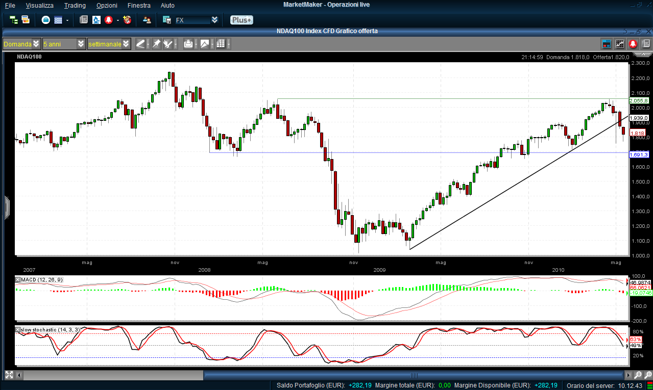 È chiaramente visibile come oramai l’indice tecnologico non sia più inserito nel forte canale rialzista in essere da un anno e mezzo, ma con la violazione della trendline rialzista da parte dei prezzi, con conferme short che arrivano da e stocastico, ci fanno pensare che questo potrebbe essere qualcosa di piu’ di un semplice ritracciamento. Come da principi base di AT non possiamo parlare di inversione di trend fino a quando non vedremo una serie di massimi e minimi decrescenti.