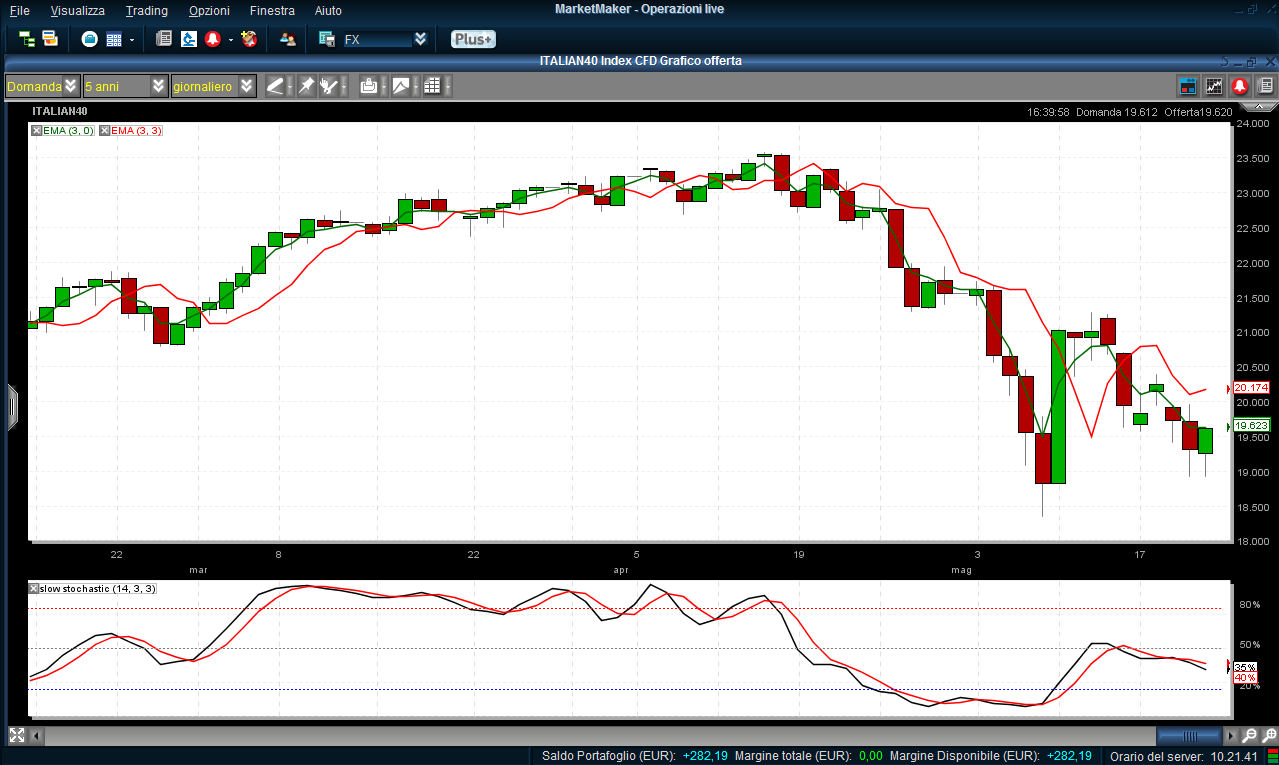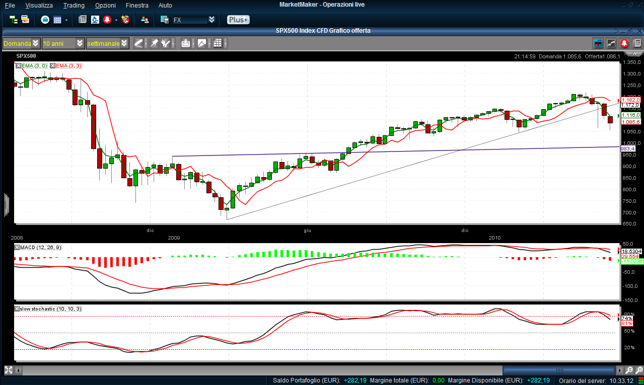 Evidenziamo nel lungo periodo quale è la situazione del principale listino americano. Dopo ormai il famoso testa e spalle rialzista, i prezzi, dopo aver violato la trendline rialzista, stanno ritracciando(era ora!!) e puntano dritti verso la neckline in area 1.000 punti. Conferme da MACD in inversione e Stocastico sotto area 80. Nel breve notiamo come le medie mobili siano ancora in posizione short ma evidenziamo divergenze rialziste tra i prezzi e il MACD, che ci fa pensare che potremmo vedere a breve una correzione al rialzo.