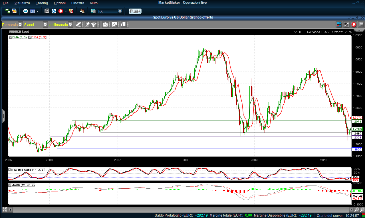 Commentare la situazione dell’euro è veramente difficile. Nel lungo e medio periodo è andato a testare i minimi storici degli ultimi 3-4 anni. Potremmo aspettarci nel breve un recupero anche abbastanza repentino del cross eur/usd. Evidenziamo divergenze rialziste prezzi-MACD. MACD, stocastico, medie mobili confermano la volontà nel breve di un recupero dei prezzi in favore dell’EURO. Obiettivo long 1,3093.