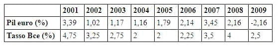I valori sono relativi al primo gennaio di ogni anno per i tassi della Bce, per il quarto trimestre dell’anno precedente per il Pil della zona euro, valori ripresi dal sito ufficiale della Bce.