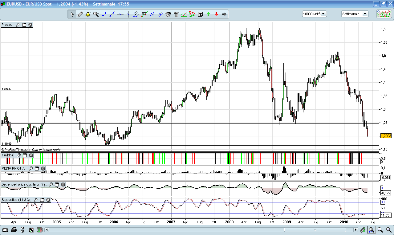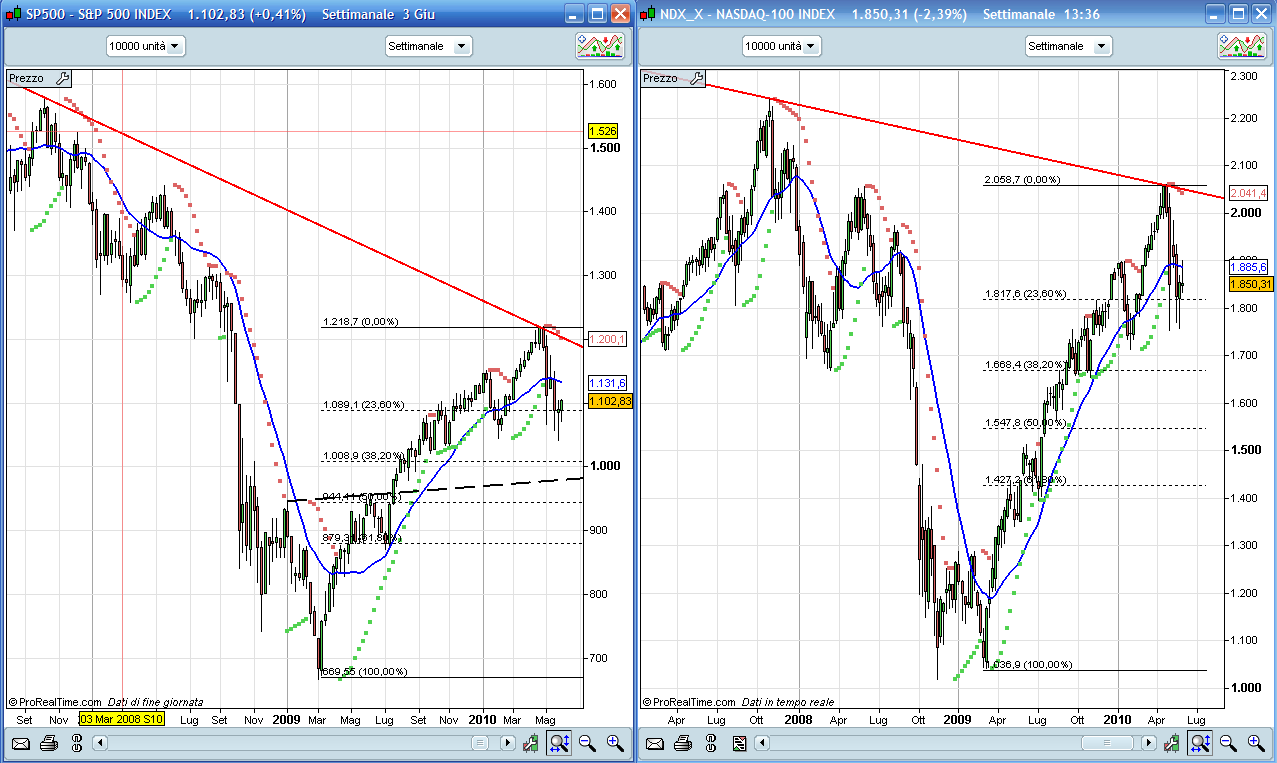 Nel lungo periodo i due principali indici americani evidenziano situazioni simili anche se con particolarità rispetto al trend differenti. Lo S&P500 dopo il testa e spalla rialzista formatosi a inizio 2009, ha formato un supporto importante in area 1,050 il cui break out porterebbe i prezzi in area 950-1,000 e solo il superamento di area 1,200 potrebbe darci nuovi segnali rialzisti di lungo periodo. Il Nasdaq sta correggendo il forte uptrend partito dopo il doppio minimo fine 2008 inizio 2009. Ricordiamo che sino a quando non vediamo una serie di massimi e minimi decrescenti non possiamo parlare di trend negativo.