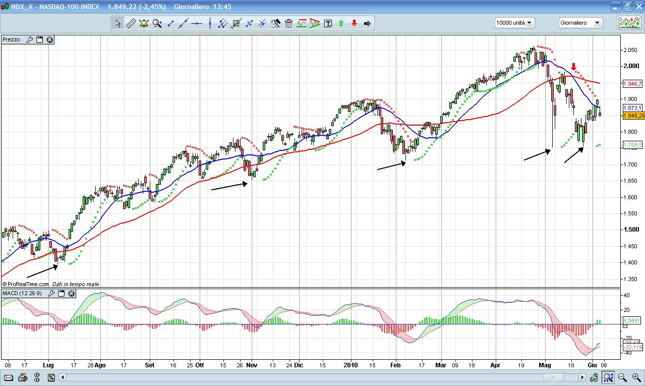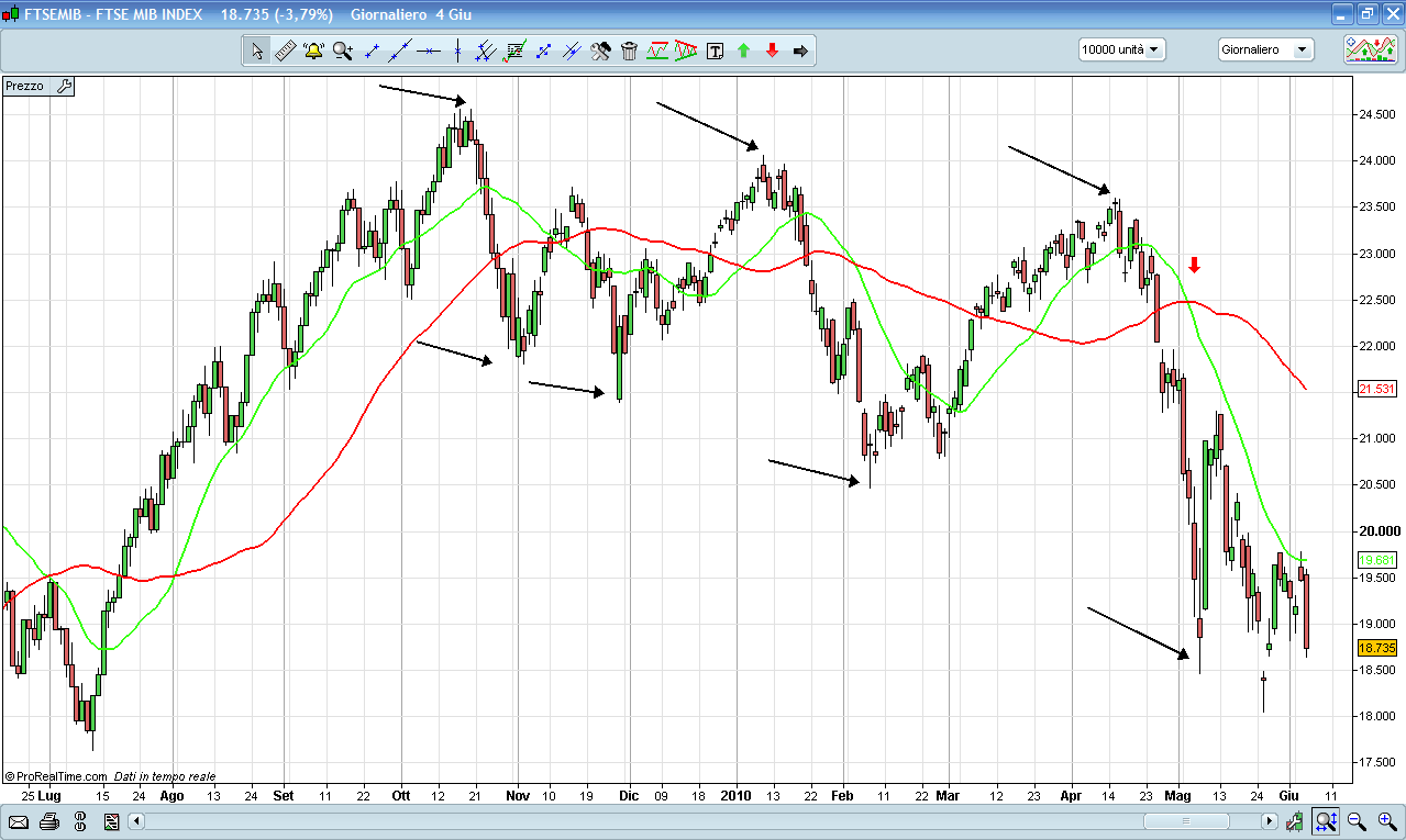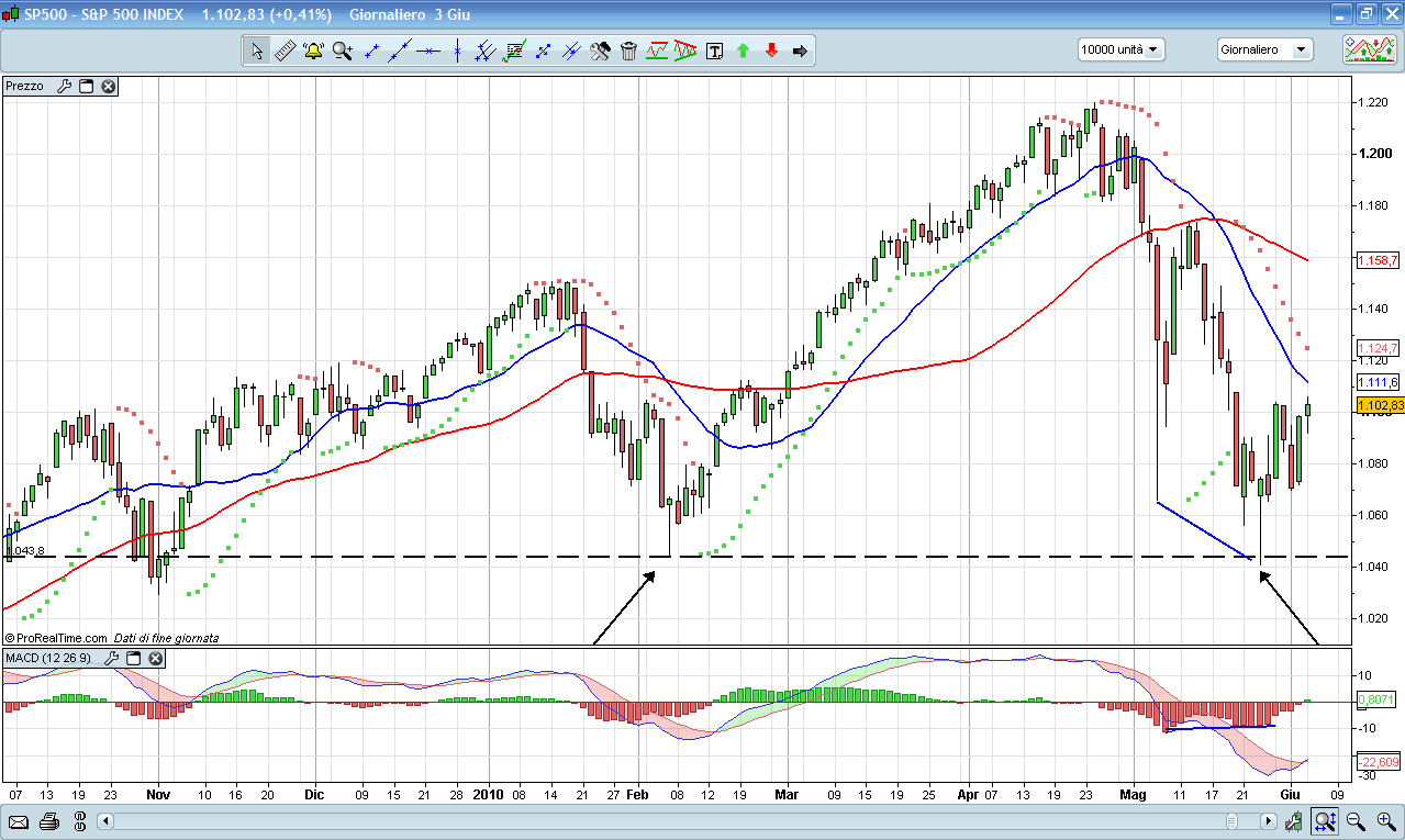 L’indice italiano, a differenza degli indici Americani, ha invertito la rotta ormai da novembre 2009, disegnando massimi e minimi decrescenti, quindi in trend negativo. Le medie mobili sono incrociate short.