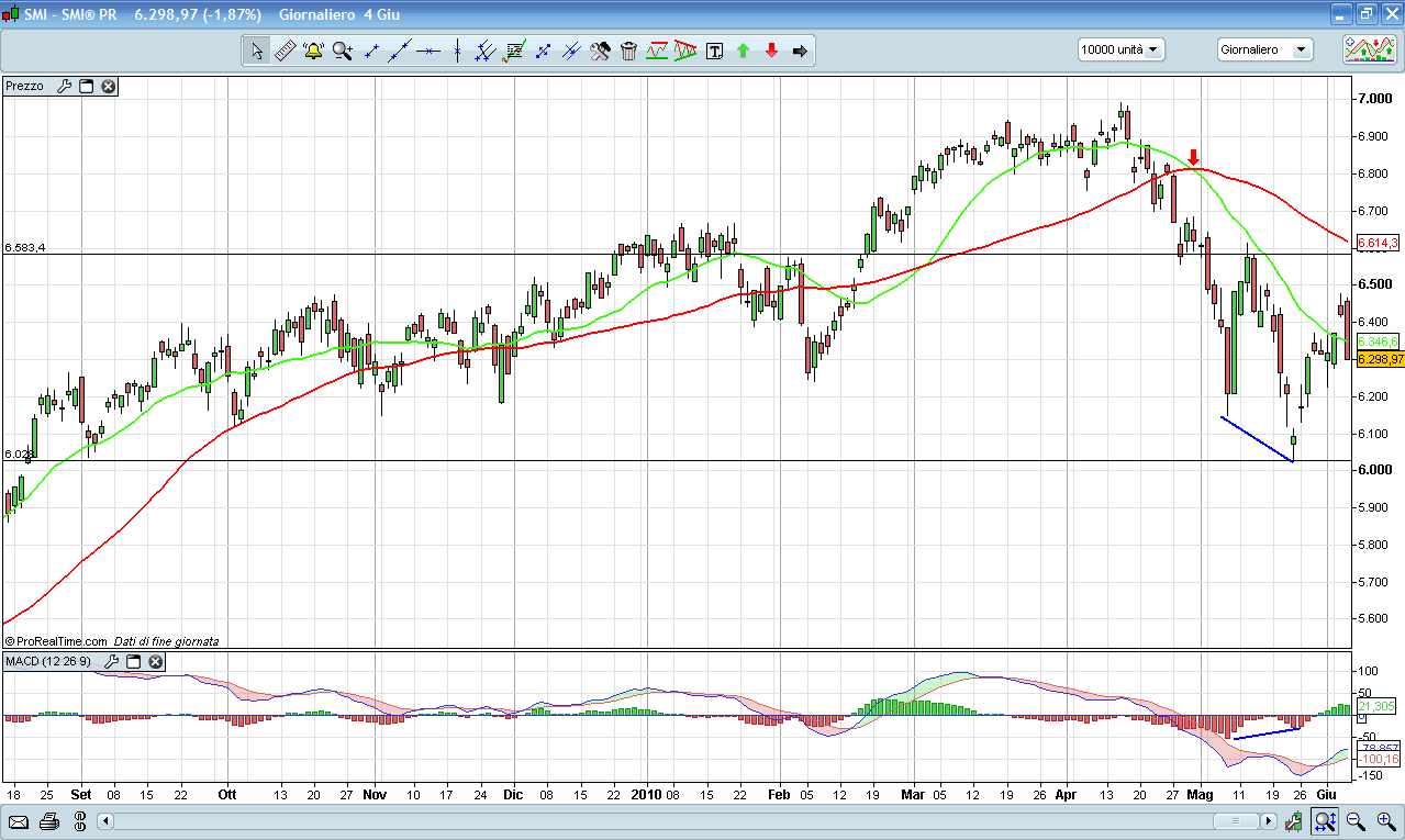 Non fa eccezione l’indice svizzero che prosegue la sua discesa dopo aver violato minimi importanti. Le medie mobili a 20 e 50 sono incrociate in posizione ribassista, il nel breve ha dato lo spunto per il ritracciamento delle ultime settimane, anticipato anche dalla divergenza con i prezzi.