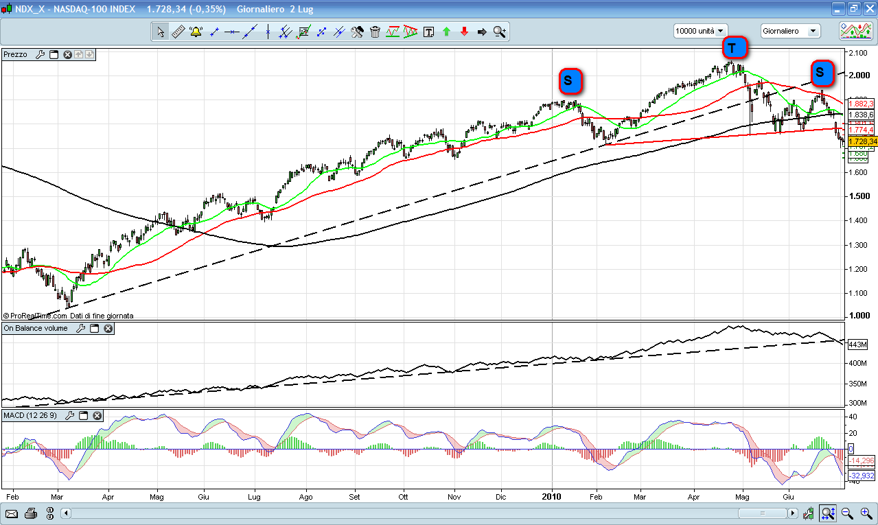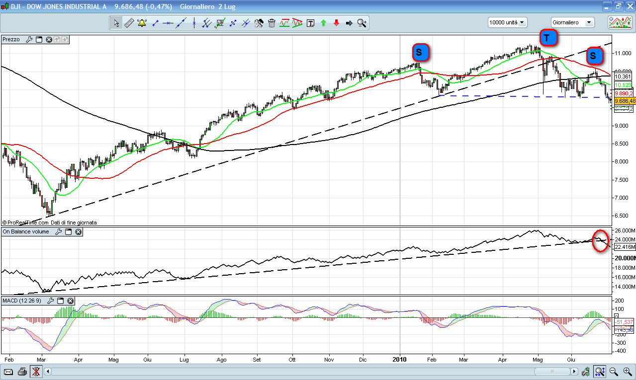 La situazione del principale indice americano è davvero cambiata! Già dall’osservazione delle medie mobili possiamo vedere l’incrocio short tra la media mobile a 20 e quella a 50, inoltre quella a 200 ormai è stava violata al ribasso nelle ultime settimane. Dopo la violazione di maggio 2010 della trendline rialzista marzo 2009-febbraio 2010, il trend ha incominciato a indebolirsi. Ormai tutti gli analisti, gli istituzionali, i traders stanno vedendo il formarsi del testa e spalle ribassista, come anche confermato dal break out avvenuto anche sulla trendline rialzista dei volumi (si noti come il testa e spalle si sia formato anche su On Balance Volume). Inoltre il MACD è in posizione negativa da alcune giornate. Se il trend ribassista dovesse confermarsi nelle prossime giornate, i primi obiettivi short sarebbero in area 8,500 punti.